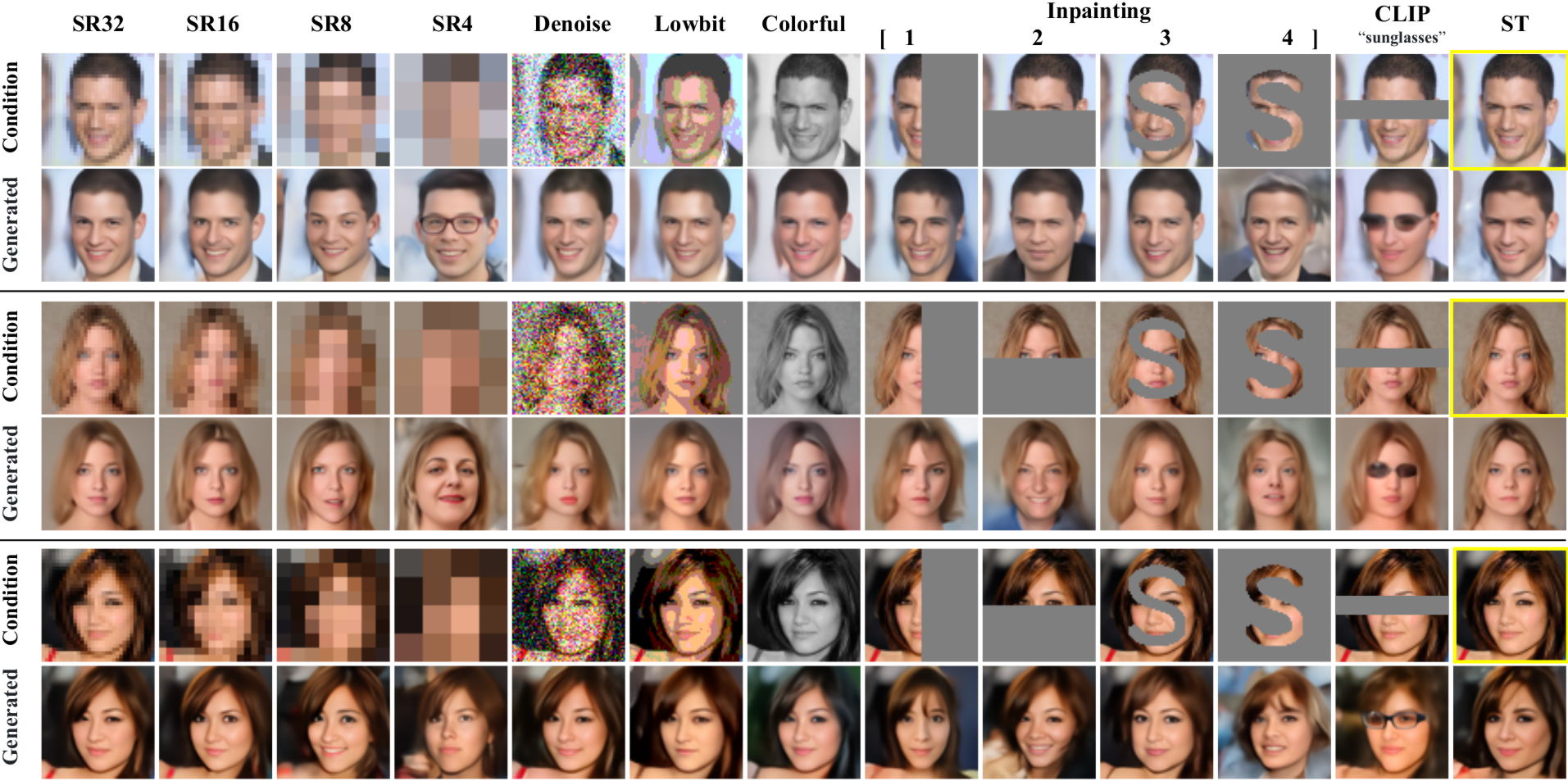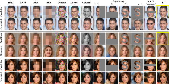 DDNはブラックボックスモデルを用いたテキストから画像への生成など、非ピクセル領域、特に勾配に依存しないゼロショット条件付き生成をサポートします。黄色の枠線で囲まれた画像がグラウンドトゥルースとして機能し、表のヘッダーにある略語はそれぞれのタスクと対応しています。「SR」は超解像(Super-Resolution)を表し、それに続く数字は解像度を示しています。「ST」はスタイルトランスファー(Style Transfer)を表しており、条件を用いて知覚損失を計算します。