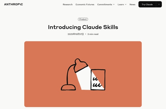 AnthropicのチャットAI「Claude」は、ユーザーのGoogleドキュメントやGmailを読み取った上で詳細な調査と分析を行うAIエージェントとしての機能「Claude Research」を備えています。2025年10月16日にはさらに、手元のタスクに関連する資料をClaudeに読み込ませることで、専門的なスキルと融合させてタスクをより効率的に実行できる「Claude Skills」の詳細が発表されました。