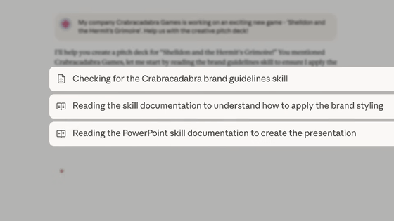 ファイルをアップロードした状態で、Claudeに「新作ゲームのスライド資料を作って」と依頼したところ、Claudeはタスクに必要なスキルを呼び出すのと同時に、アップロード済みの資料を参照して必要な情報を自動で抽出しました。