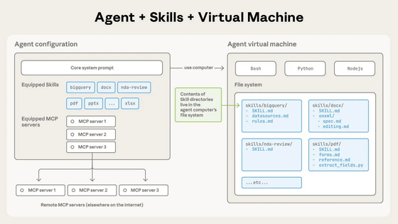 そのほか、Claude Skillsは「スキルの組み合わせが可能」「Claudeアプリ、Claude Code、APIにおいて共通形式で使える」「単なるプロンプトによる生成ではなく、スキル内に実際のコードを含め、そのコードをClaudeが安全に実行して結果を返すことができる」といった特徴を備えています。
