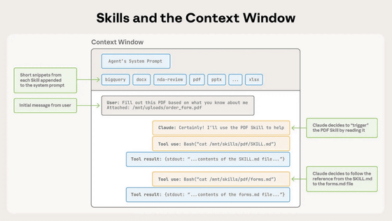 Agent Skillsは、基本となる「SKILL.md」というファイルにスキルの名前や説明を記載し、必要に応じて他のファイルを組み合わせて構成されます。スキルが複雑化するにつれて単一の「SKILL.md」に収まらないほど多くのコンテキストが含まれるようになりますが、Claudeは名前を参照して特定のスキルを呼び出すため、タスクに応じて必要な情報だけを効率的に読み込むことで、無駄な処理を避けつつ専門的な作業を実行できます。スキルの実行には直接的な指示は必要なく、ユーザーのメッセージによって必要なスキルがトリガーされ、Claudeの応答が変化します。