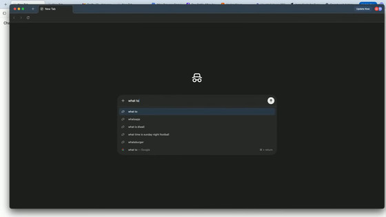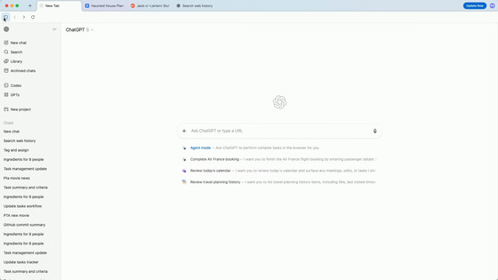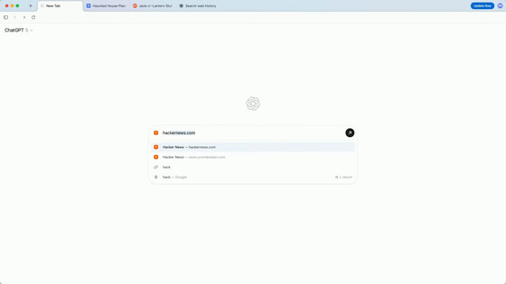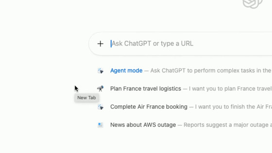 ChatGPT AtlasはChromiumベースのブラウザで、新規タブページにはURL入力欄を兼ねたChatGPTのチャットウィンドウがあります。
