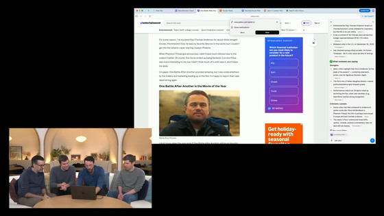 ChatGPT Atlasの特徴の1つが、ウェブ上のあらゆる場所でChatGPTをシームレスに利用できる「Chat anywhere」です。閲覧中のページ内容をChatGPTが即座に理解するため、コピー&ペーストやタブを切り替える手間なく、開いているウィンドウで直接サポートを受けられます。例えば、気になる映画のレビューサイトを見ている時、「Ask ChatGPT」というサイドバーを開いてそのレビューの概要をChatGPTに作成させることが可能です。
