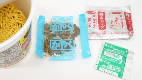 フタを開けるとかやく、粉末スープ、調味油の袋が出てきました。