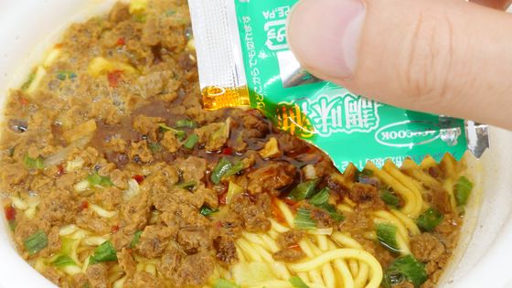 かやくを入れて熱湯を注ぎ、調味油をフタの上で温めながら3分待ちます。