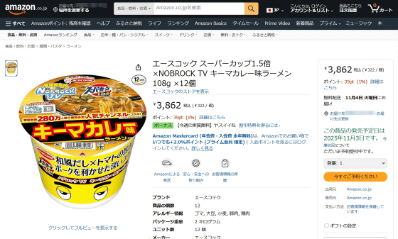 「スーパーカップ1.5倍×NOBROCK TV キーマカレー味ラーメン」の希望小売価格は税抜298円で、2025年11月3日(月)から全国の小売店や通販で購入可能。記事作成時点ではAmazon.co.jpで予約注文が可能で、価格は12個セットで税込3862円(1個あたり約322円)でした。