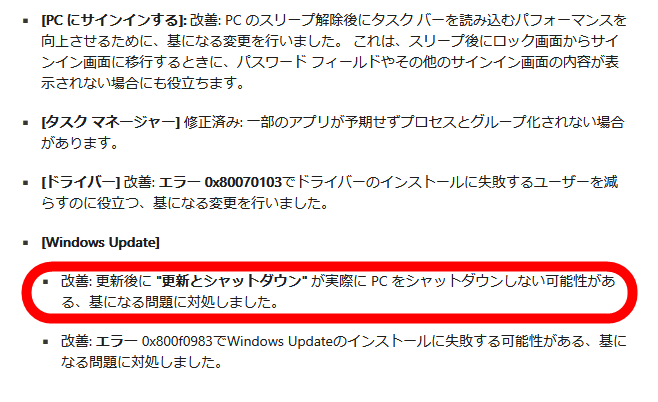 2025年10月28日配信されたプレビュー更新プログラム「KB5067036」のリリースノートが以下。「更新してシャットダウン」で実際にはシャットダウンできない問題を解決したことが分かります。