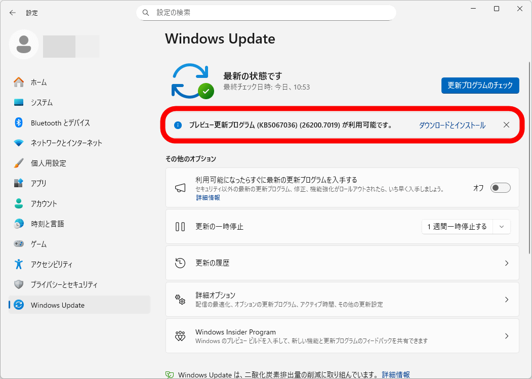 KB5067036は2025年11月のセキュリティ更新プログラムに含まれる内容を一足早く使えるプレビュー更新プログラムとしてリリースされています。このため、KB5067036を適用するには設定アプリのWindows Upadate画面から「ダウンロードとインストール」をクリックする必要があります。
