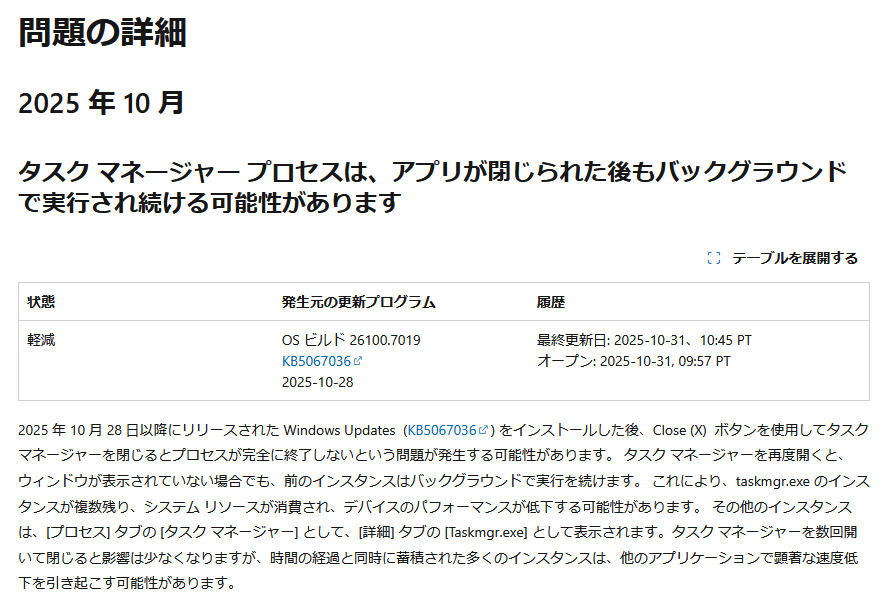 KB5067036にはシャットダウンの問題解決以外に複数の機能更新も含まれているのですが、同時に「タスクマネージャーの画面を閉じた後もプロセスが残り続ける」という新たな問題が発生したことも明らかになっています。Microsoftの問題通知ページによると、タスクマネージャーのインスタンスが多重起動されることによって他のアプリケーションの動作速度が低下する可能性があるとのこと。