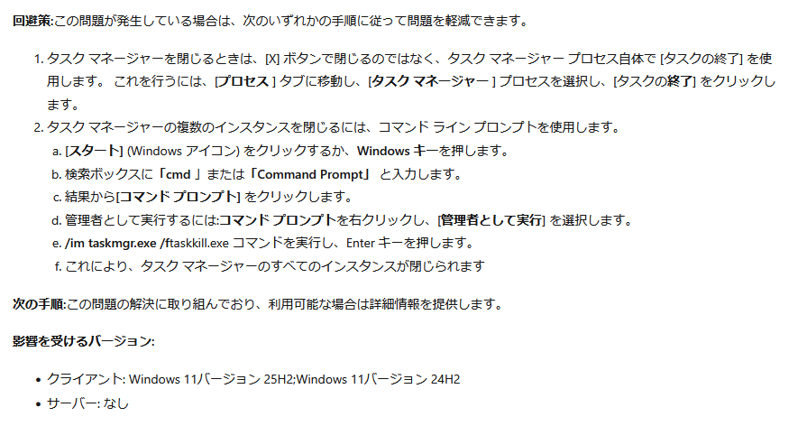 Microsoftは対策手法としてコマンドプロンプトを管理者として実行して「タスクマネージャーのプロセスを終了させるコマンド」を実行するように案内しています。なお、正しいコマンドは「taskkill.exe /im taskmgr.exe /f」ですが、Microsoftの日本語ドキュメントは機械翻訳によって間違ったコマンドに訳されているので注意が必要です。