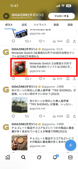 新たなUIのテストは2025年10月下旬頃に始まり、2025年10月25日にはテスト対象が全世界のiOS版Xアプリに広がりました。実際のUIは以下の通り。まず、ポストに含まれるリンクをタップします。