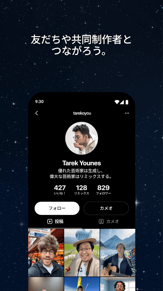 また、ユーザーをフォローする機能や、他のユーザーが生成した動画を元に新たな動画を作り出すリミックス機能も搭載しています。