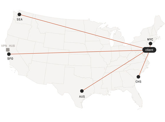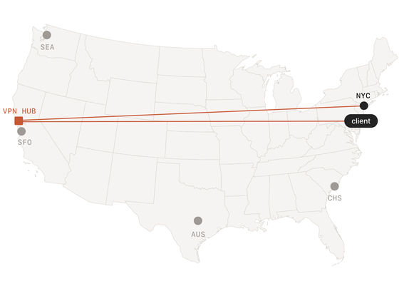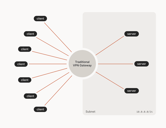 従来のVPNは、各クライアントデバイス(ノートPCなど)が中央の「コンセントレーター」またはVPNゲートウェイに接続する「ハブアンドスポーク」アーキテクチャを採用しています。