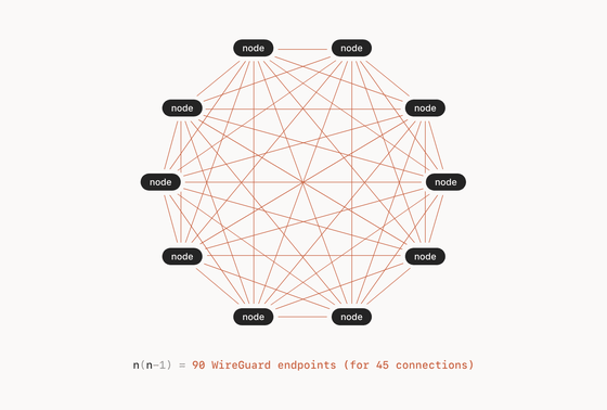 メッシュネットワークでは、効率の良いピアツーピアアプリを設計できますが、10ノードのネットワークには10×9=90のWireGuardトンネルエンドポイント設定が必要になります。すべてのノードは自分の鍵に加えてさらに9つの鍵を知る必要があり、鍵を更新したりユーザーを追加・削除したりするたびに、各ノードを更新する必要があります。さらに、ノードは何らかの方法でお互いを見つける必要があります。ユーザーデバイスが静的IPアドレスを持つことはめったにありません。また、カフェ・ホテル・空港などの公共施設ではファイアウォールにより簡単にポートを開くこともできません。会社にコンプライアンス要件がある場合、すべてのノード間のトラフィックをブロックおよび監査できる必要があります。
