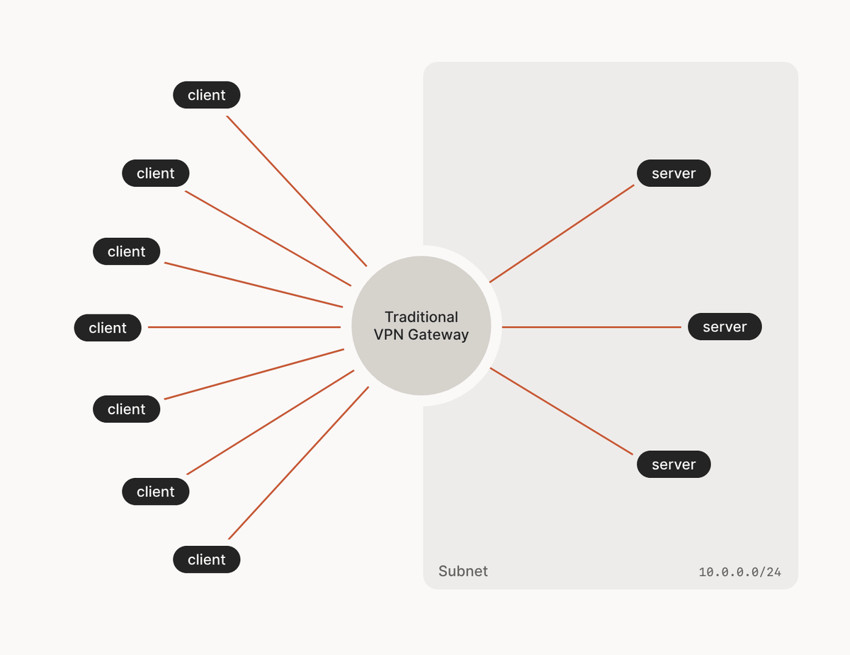 従来のVPNコンセントレーターは管理とデータ転送の両方を中央集中化し、パフォーマンスに限界が生じますが、Tailscaleのデータ処理能力はノード数に応じてスケールアップします。