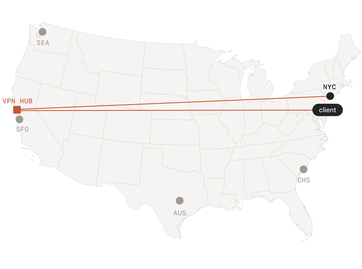 ハブアンドスポークはうまく機能しますが欠点があります。通常、企業は単一のVPNコンセントレーターを構成してからセカンダリトンネルをセットアップしますが、スケールが難しい場合が出てきます。まず、リモートユーザーはVPNコンセントレーターに近い場合も遠い場合もあります。遠い場合は、接続時に高いレイテンシーが発生します。次に、到達したいデータセンターもVPNコンセントレーターに近くない場合があります。遠い場合は、再び高いレイテンシーが発生します。