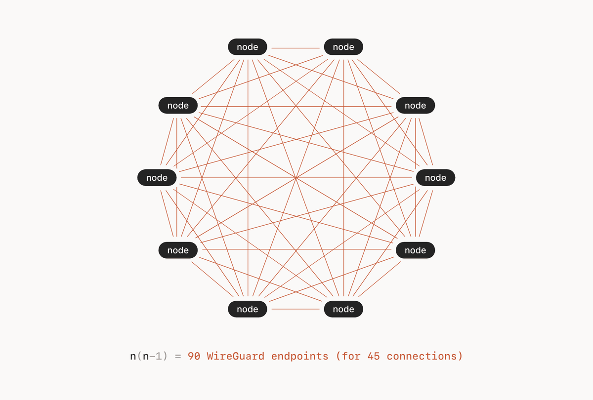 メッシュネットワークでは、効率の良いピアツーピアアプリを設計できますが、10ノードのネットワークには10×9=90のWireGuardトンネルエンドポイント設定が必要になります。すべてのノードは自分の鍵に加えてさらに9つの鍵を知る必要があり、鍵を更新したりユーザーを追加・削除したりするたびに、各ノードを更新する必要があります。さらに、ノードは何らかの方法でお互いを見つける必要があります。ユーザーデバイスが静的IPアドレスを持つことはめったにありません。また、カフェ・ホテル・空港などの公共施設ではファイアウォールにより簡単にポートを開くこともできません。会社にコンプライアンス要件がある場合、すべてのノード間のトラフィックをブロックおよび監査できる必要があります。