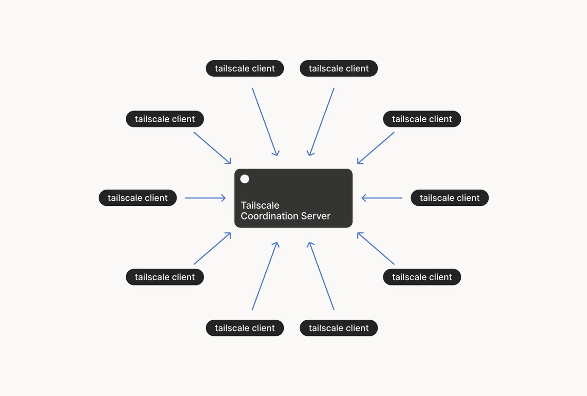 メッシュネットワークを構築するにはTailscaleノードソフトウェアを使い、調整サーバーとして動作するlogin.tailscale.comとやり取りします。ハブアンドスポーク方式と似ていますが、暗号鍵をやり取りしネットワークのポリシーを設定する役割だけを担います。