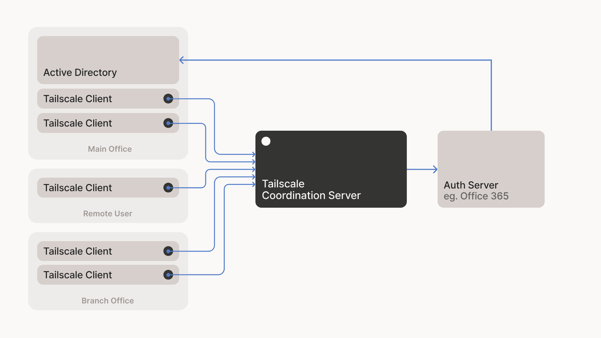 調整サーバーからどの公開鍵をどのノードに送信するかは、調整サーバーへの認証により決定されます。認証はGmail・G Suite・Office 365など、OAuth2・OIDC(OpenID Connect)・SAMLプロバイダーに認証を任せることで、ユーザーアカウントまたは証明書のセットをTailscale側で保存する必要がなくなり、個人識別情報を最小限に抑えながら、信頼性の高いサービスを運用できます。