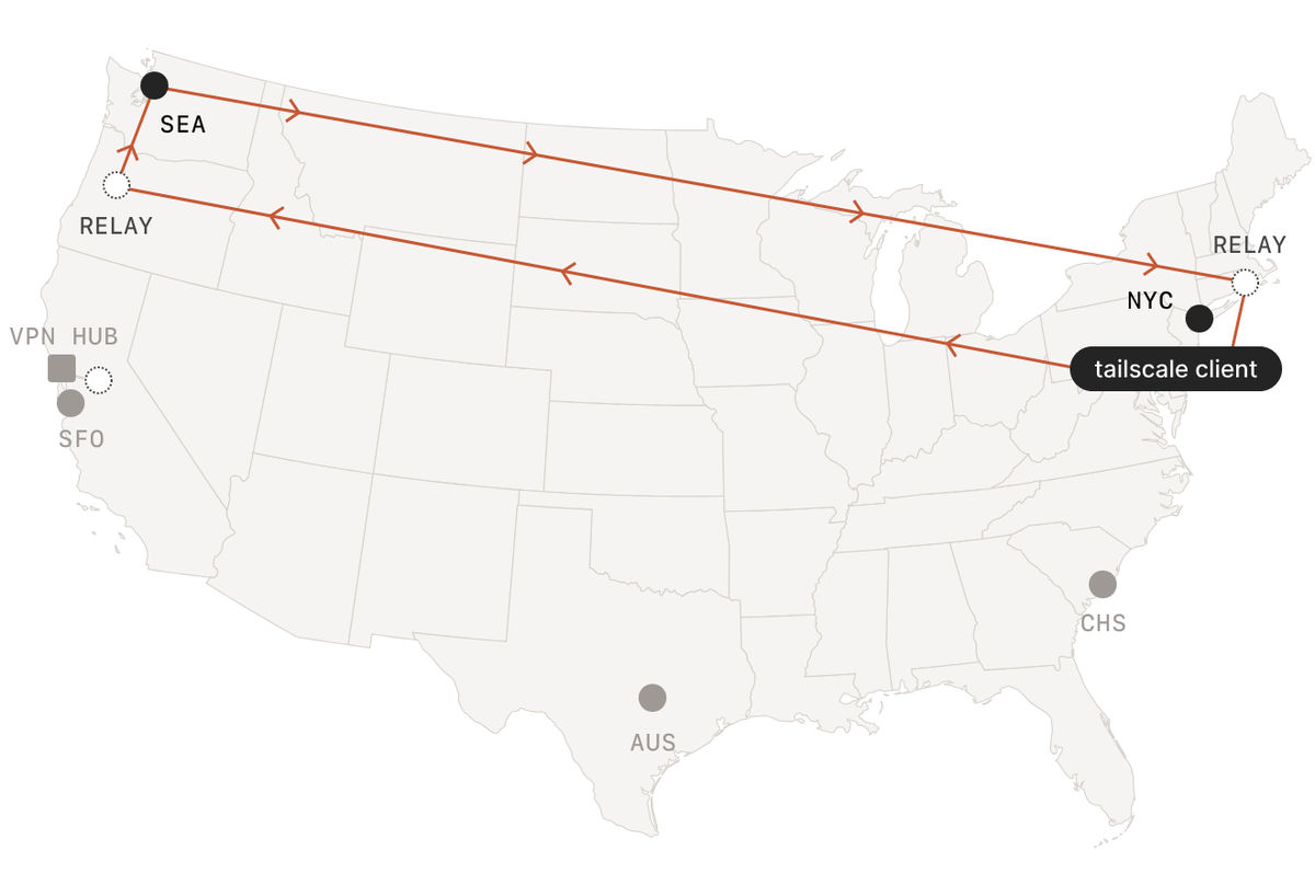さらに厳しいネットワークの中には、UDPを完全にブロックし、STUNとICEを使用してもトラバースできないほど厳格なものがあるため、TailscaleはDERP(Designated Encrypted Relay for Packets)サーバーのネットワークを提供しています。ICE標準のTURNサーバーと同じ役割を果たしますが、従来のTURNの推奨方式の代わりにHTTPSストリームとWireGuard鍵を使用します。