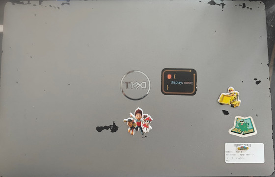 DELLのノートPCに控えめに貼られたステッカーたち。かなり年季の入った端末で、ロゴのそばに『パウ・パトロール』のステッカーが目立っています。