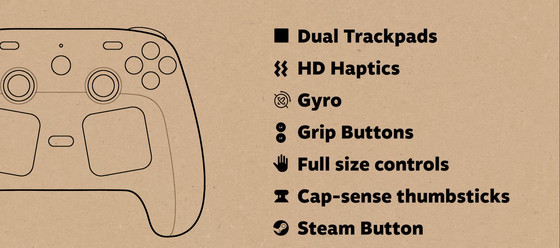特徴はデュアルトラックパッド、HDハプティック振動、ジャイロ機能、背面グリップボタン、フルサイズコントロール、静電容量センシングのアナログスティック、Steamボタンを搭載。バッテリーは8.39 Whリチウムイオンバッテリーで、35時間以上のゲームプレイが可能です。