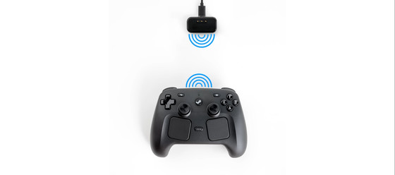 Steam ControllerはSteam用に設計されたコントローラーで、PCとワイヤレス接続が可能。なお、Steam MachineにはSteam Controllerとの接続アダプターが内蔵されています。