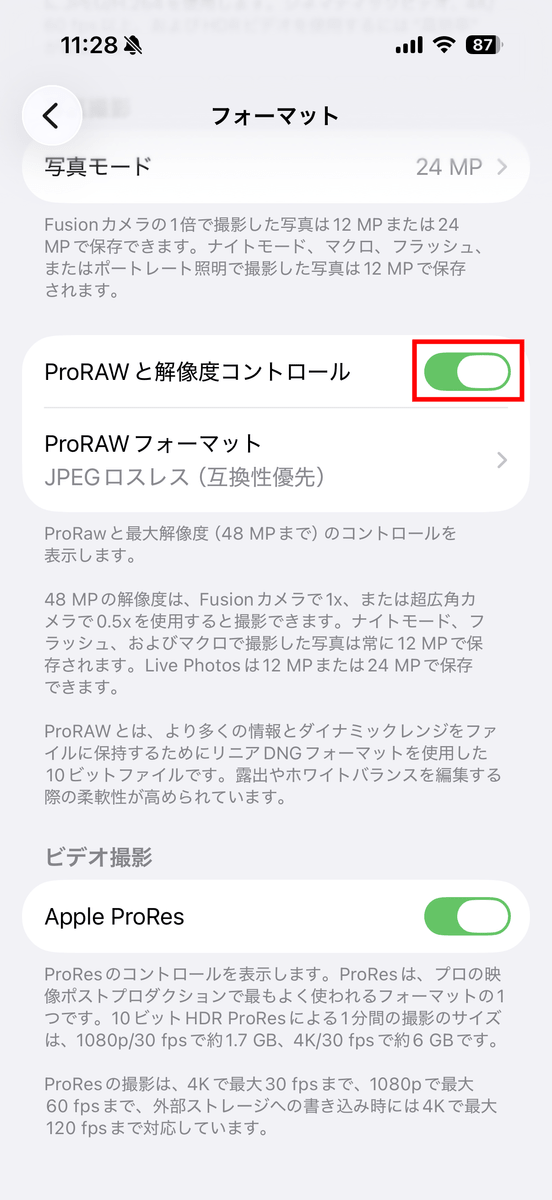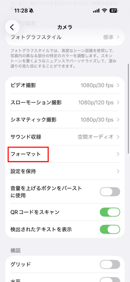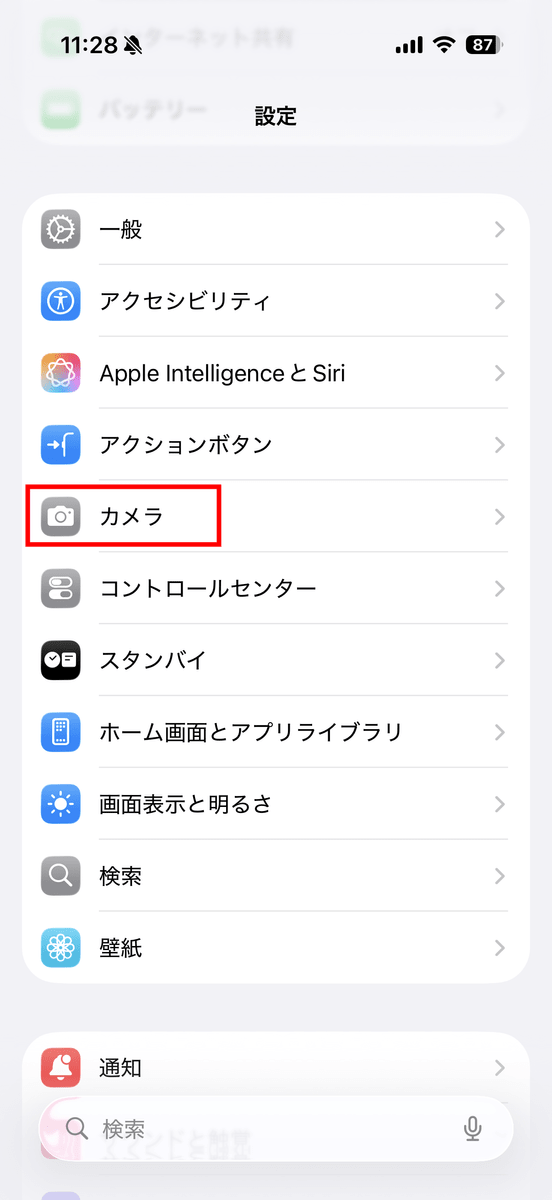 iPhone 12 Pro以降のiPhoneでは、「Apple ProRAW」を使って解像度を上げておくと鮮明に写ります。iOS 26でApple ProRAWを使うためにはiPhoneの設定アプリから「カメラ」をタップ。