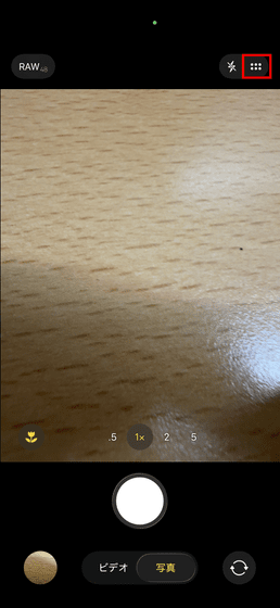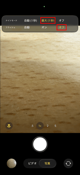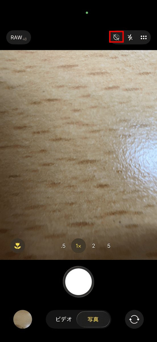 露出時間を設定するには、カメラアプリを開いて右上に表示されるナイトモードのアイコンをロングタップします。被写体が暗くないとナイトモードのアイコンが出てこないので、明るい場所にいるときはカメラを手で覆うなどしてください。
