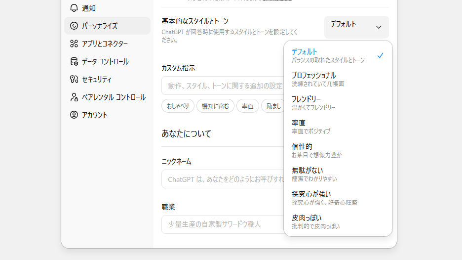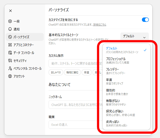 さらに、ChatGPTの性格を設定できる「基本的なスタイルとトーン」に「プロフェッショナル:洗練されていて几帳面」「素直:素直でポジティブ」「個性的:お茶目で想像力豊か」という性格が追加されました。旧来の「ロボット」は「無駄がない」という名前に変更されています。