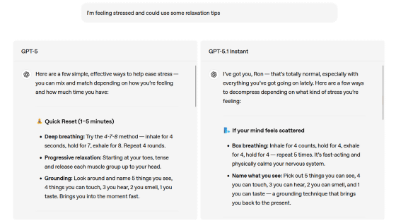GPT-5.1 InstantはChatGPTで最も多く使われるタイプのモデルで、温かみのある応答を返すように調整されています。以下の画像は「ストレスを感じているからリラックスできる方法を知りたい」という入力に対するGPT-5(左)とGPT-5.1(右)の反応を並べたものです。GPT-5は「リラックスの方法の提案」を即座に始めていますが、GPT-5.1の応答は「ロン、大丈夫だよ。特に、最近はいろいろ大変なことが起きてるからね」という共感から始まっています。