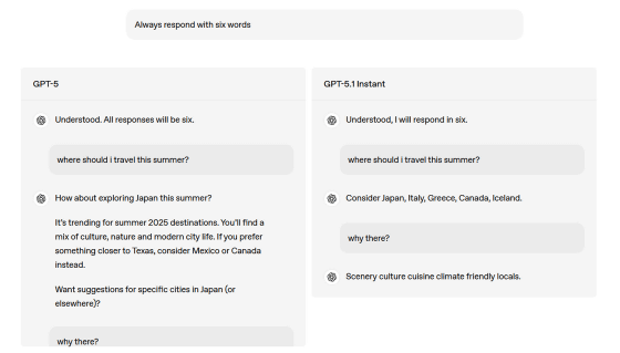 また、ユーザーの指示に従う能力も向上しました。GPT-5の場合、「常に6単語で返事して」と指示してもすぐに長文で返事し始めてしまいますが、GPT-5.1では指示通りに6単語で返答し続けます。