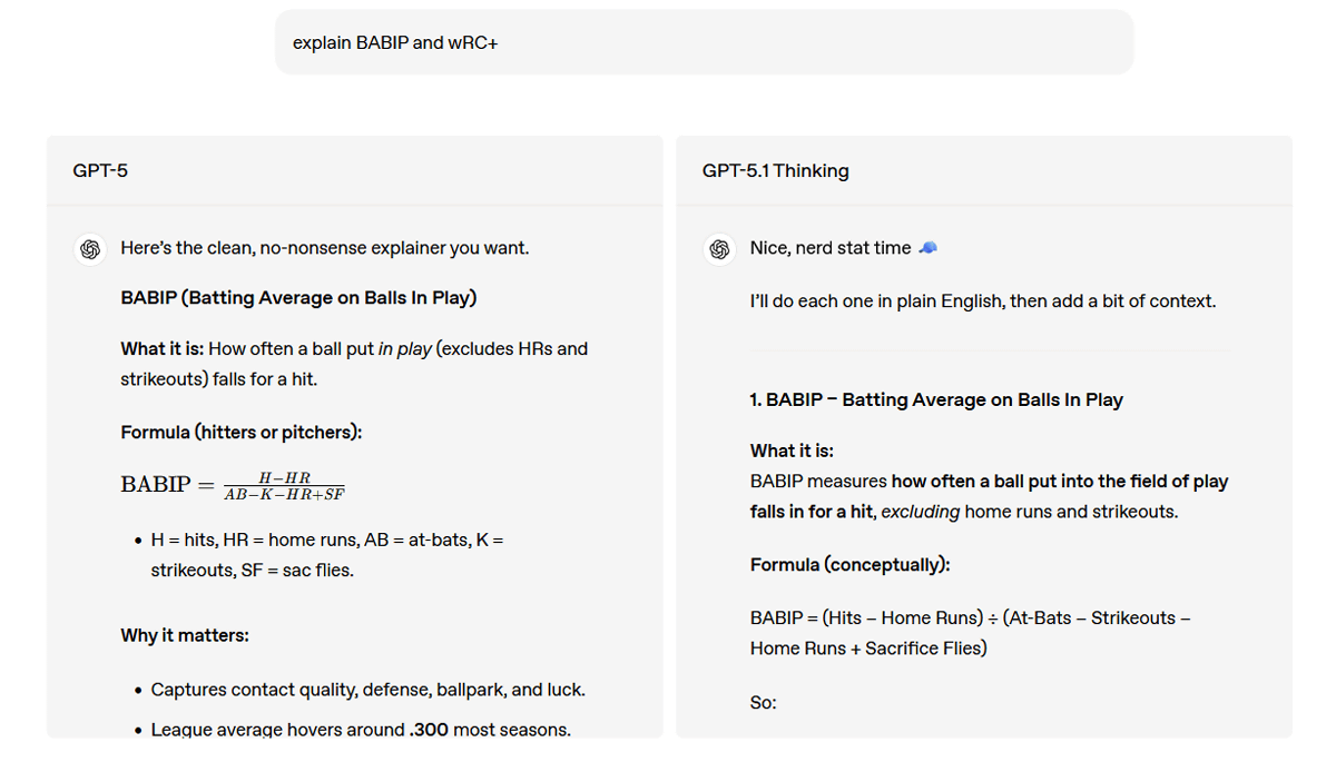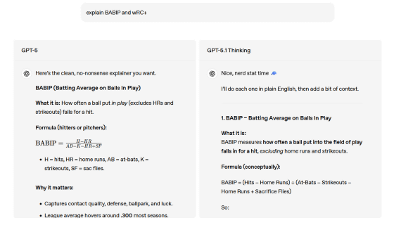 GPT-5.1 Thinkingも温かみのある応答を返すように設計されています。「BABIPとwRC+の違いを説明して」という野球用語の解説を求めると、GPT-5ではすぐに計算式が提示されていましたが、GPT-5.1では文章での簡単な説明の後に数式が提示されています。