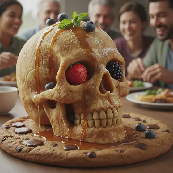 Create an image of a three-dimensional pancake in the shape of a skull, garnished on top with blueberries and maple syrup.(頭蓋骨の形をした立体的なパンケーキの画像を作成し、その上にブルーベリーとメープルシロップをトッピングする。)