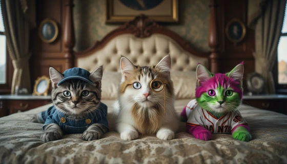 – 右側:#9F2B68と#00FF00の毛色が目立つ子猫。サンフランシスコ・ジャイアンツのユニフォームを着用。