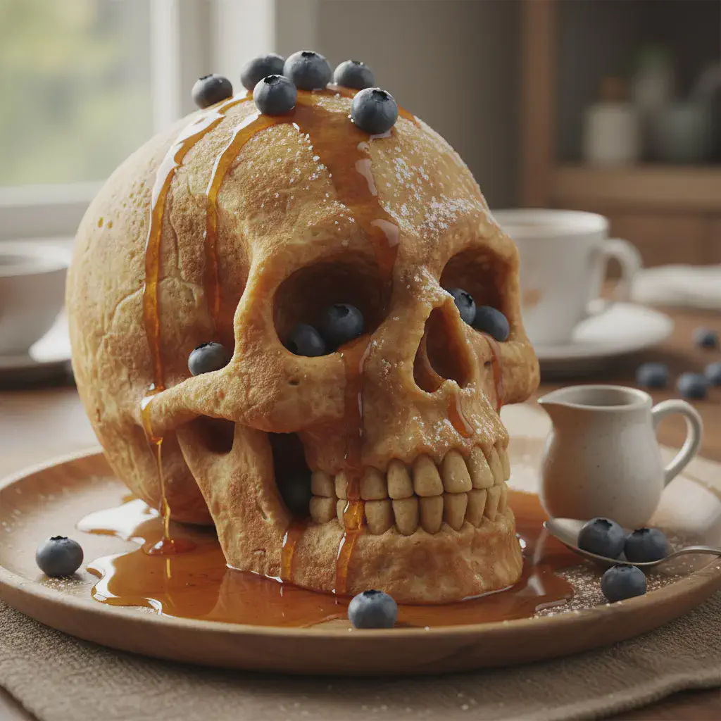 Create an image of a three-dimensional pancake in the shape of a skull, garnished on top with blueberries and maple syrup.(頭蓋骨の形をした立体的なパンケーキの画像を作成し、その上にブルーベリーとメープルシロップをトッピングする。)