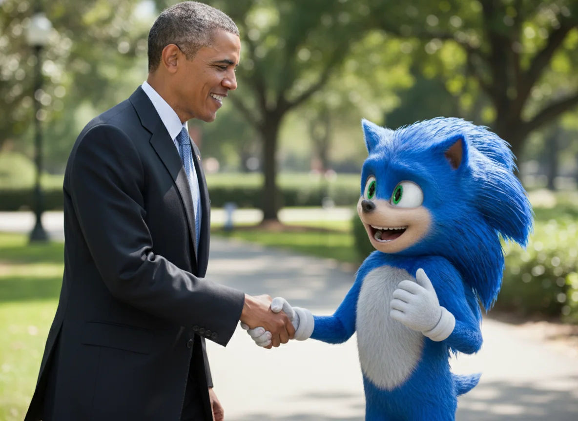 Create an image of the character in all the user-provided images smiling with their mouth open while shaking hands with President Barack Obama.(ユーザーが提供したすべての画像において、そのキャラクターが口を開けて笑顔でバラク・オバマ大統領と握手しているイメージを作成してください。)