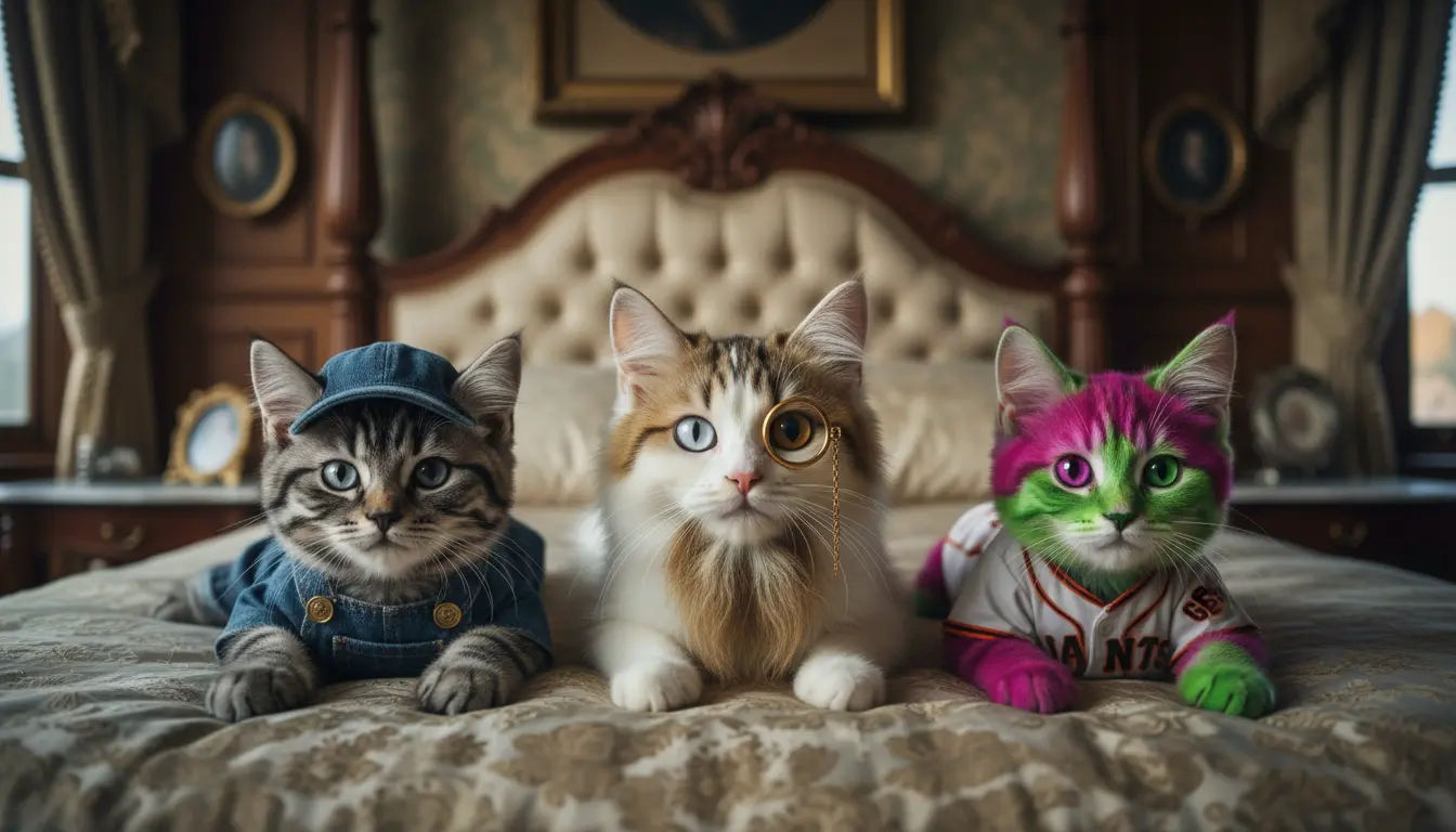 – Right: a kitten with prominent #9F2B68-and-#00FF00 fur, wearing a San Franciso Giants sports jersey.