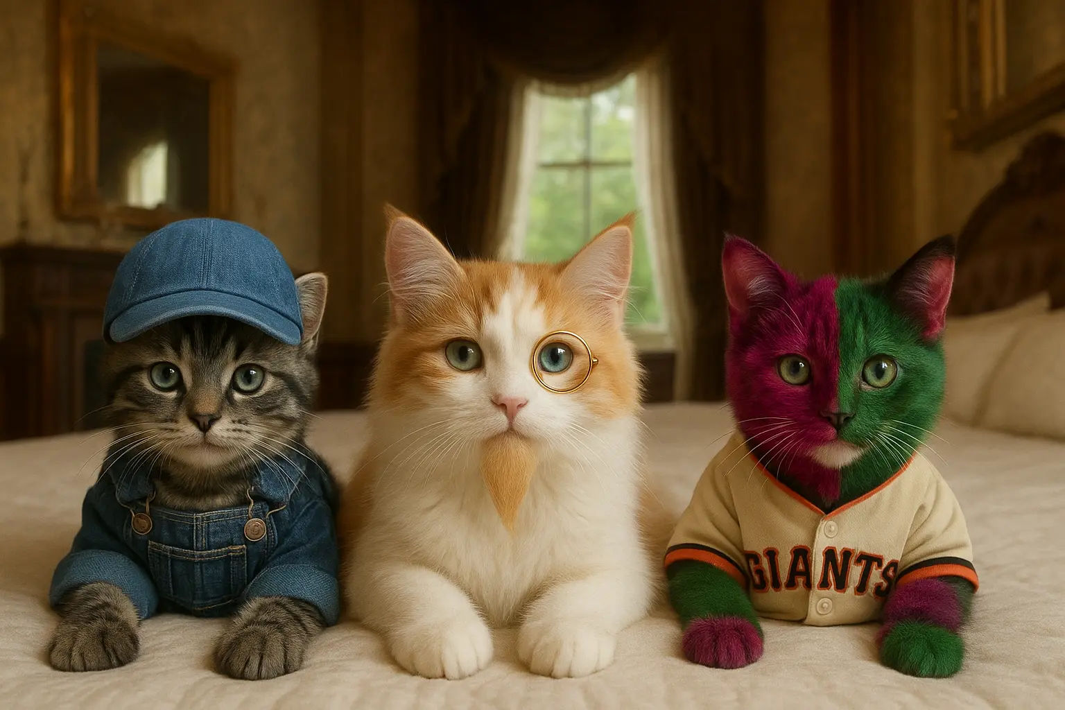 – 右側:#9F2B68と#00FF00の毛色が目立つ子猫。サンフランシスコ・ジャイアンツのユニフォームを着用。