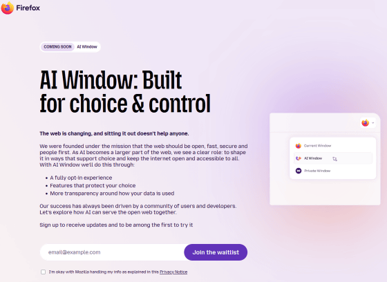 AIウィンドウは開発中の段階で、以下のリンク先からウェイトリストに登録すると最新情報を受け取れます。