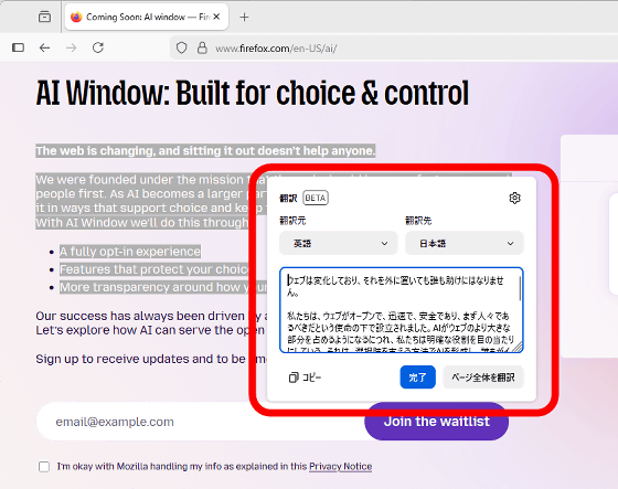 ローカルで動作するAIを用いたページ翻訳機能。日本語への翻訳にも対応しており、ページ全体だけでなくページの一部分を翻訳することもできます。