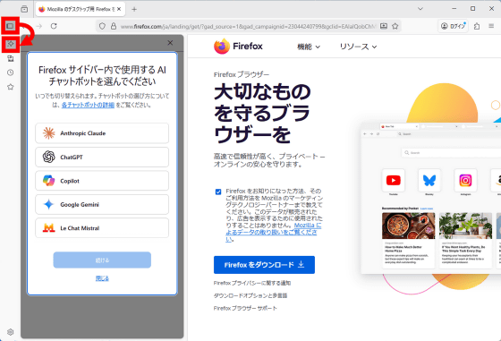 FirefoxにはChatGPTやGeminiといったチャットAIを使えるサイドバーも用意されています。サイドバーを開くには、サイドバー開閉ボタンをクリックしてからAIチャットボットボタンをクリック。もしくは「Ctrl+Alt+X」というショートカットキーを押します。