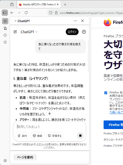 使いたいAIサービスを選択すると、ブラウジングしつつサイドバーでAIと会話できるようになります。