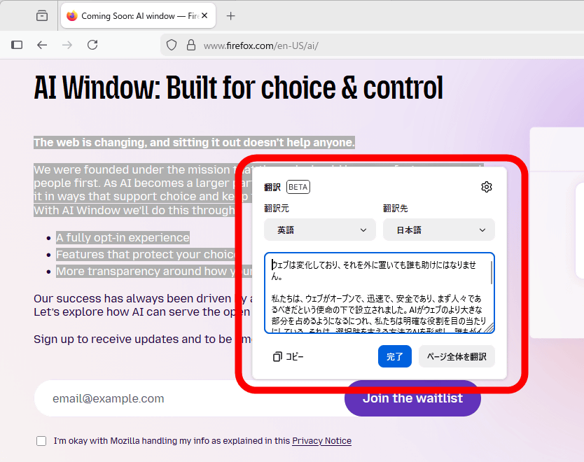 AIウィンドウは開発中の段階で、以下のリンク先からウェイトリストに登録すると最新情報を受け取れます。