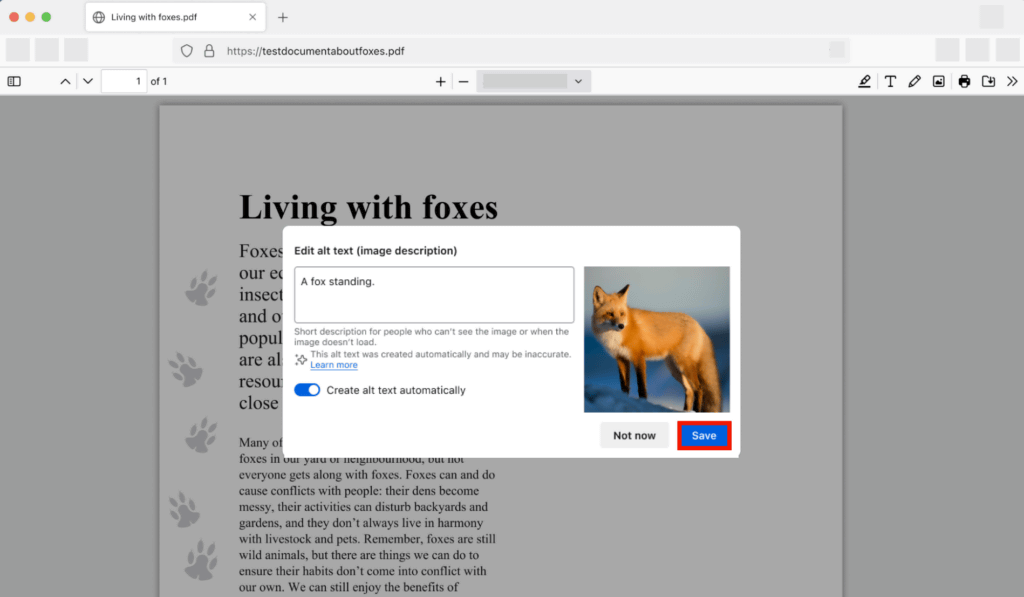 PDFに画像を追加する際に自動で画像の説明文を生成する機能も開発されています。