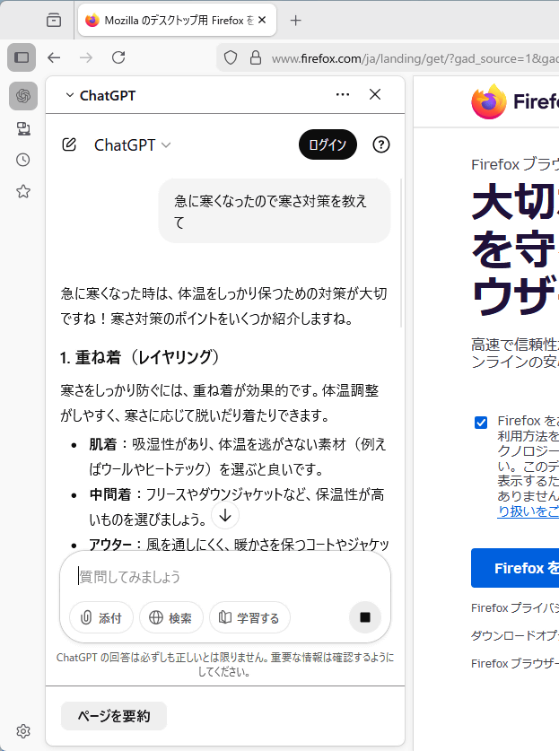 使いたいAIサービスを選択すると、ブラウジングしつつサイドバーでAIと会話できるようになります。