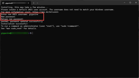 WSLのインストールが完了すると一旦Windowsを再起動します。その後Ubuntuを起動すると、初回起動時はユーザー名とパスワードの設定が求められるので、任意のユーザー名とパスワードを入力して設定します。入力後、プロンプトが表示されるようになればWSL上のUbuntuが使える状態になっています。