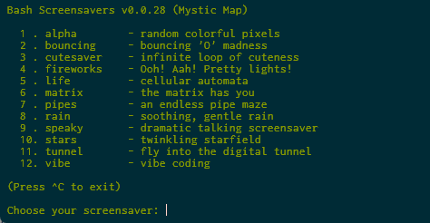 ./screensaver.sh正常に起動すると、以下のようにメニュー画面が表示されます。メニューには様々なスクリーンセーバーがリストアップされています。最終行の「Choose your screensaver:」の後ろにカーソルがある状態となっており、1から12までの番号を入力すると番号に対応するスクリーンセーバーが起動します。スクリーンセーバーを終了してメニューに戻るには、CtrlキーとCキーを同時に押します。メニューも終了したい場合は、もう一度CtrlキーとCキーを同時押しすることでプロンプトに戻ります。
