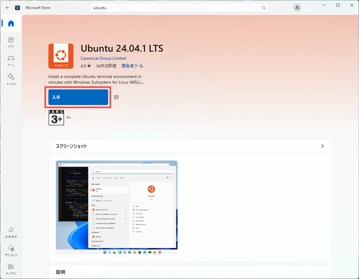 まずはMicrosoft StoreよりUbuntuをインストールします。記事作成時点で最新のLTS版であるUbuntu 24.04.1 LTSを選択し、「入手」ボタンをクリックしてインストールします。