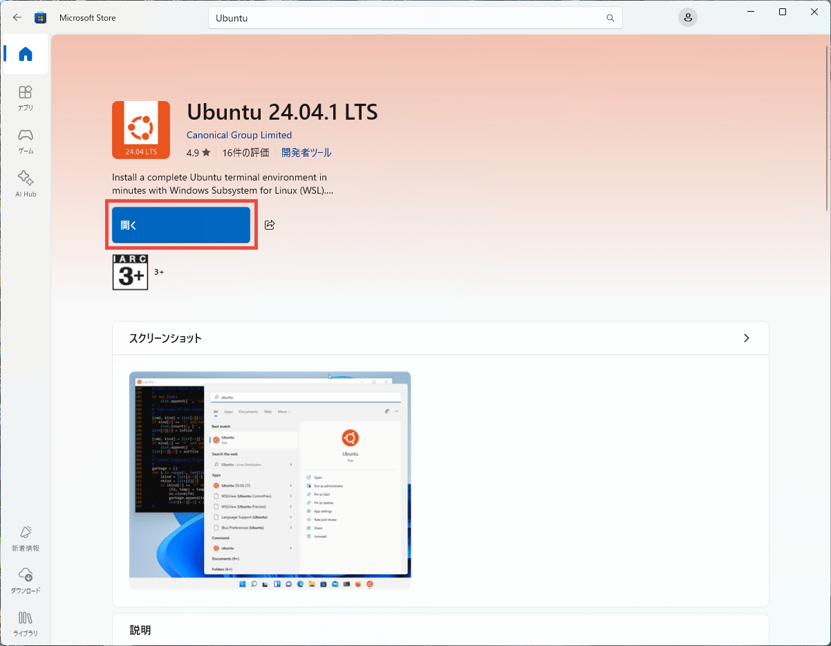 インストールが完了すると「入手」ボタンが「開く」ボタンに変わるので、「開く」ボタンをクリックしてUbuntuを起動します。